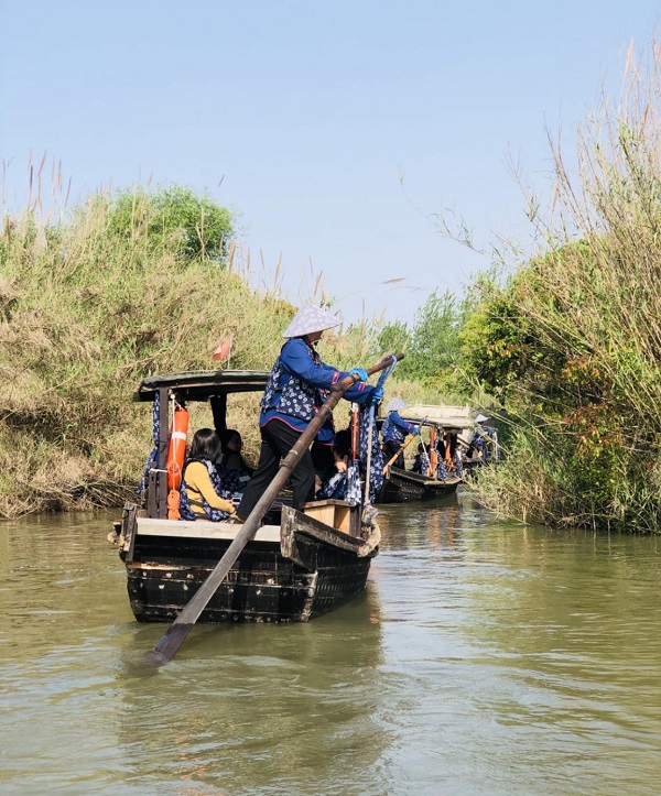 青青芦荡,浩荡无际。坐上芦苇荡里穿梭的手摇船,听讲解员讲述了“千顷苇塘筑伟绩”历史事迹,探寻着眼前这纵横交错的芦苇荡,想象着这竟成了与敌抗争的战场。