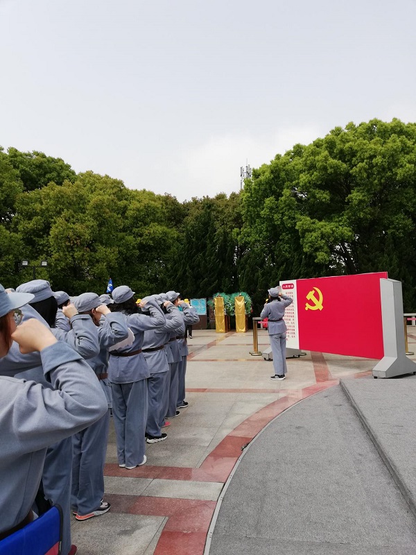 在革命教育园区中心的瞻仰广场上,党员教师列队立正,向革命先烈脱帽鞠躬致敬。党委书记黄岳峥、院长余素青代表全体教师向革命烈士敬献花圈、整理缎带,致以最高敬意。在黄岳峥带领下,面对鲜红的党旗,全体党员教师集体重温入党誓词。