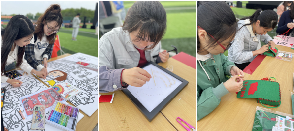 为进一步弘扬红色精神、劳动精神,培养劳动兴趣,发挥劳动育人功能,观影前还组织学生开展红色手工纪念品制作活动。活动现场欢乐而热闹,同学们亲手制作党徽钉线绕画、精美红军包、裁剪爱党主题剪纸,参与党史主题喷绘活动等,书写党旗下的青春,营造红色青春氛围。