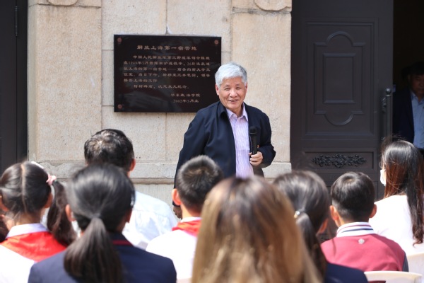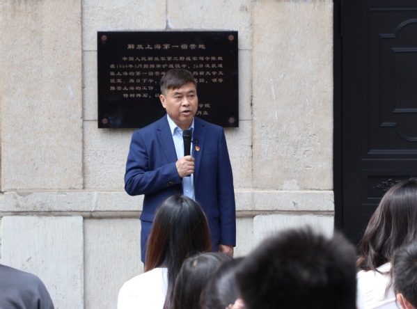 长宁校区交谊楼留存着一段光荣历史,1949年5月26日,中国人民解放军第三野战军司令员陈毅选择此处为解放上海第一宿营地。著名党史、军史专家,上海交通大学历史系教授刘统和我校原党校副校长张令高在交谊楼前,以《火种》《印痕》为主题,情景交融、声情并茂地为师生讲述了一堂校园微党课,使聆听者身临其境,置身上海党史发展缩影的华政园内,于一步一景中感受历史的厚重。活动现场还举行了党史学习教育书籍赠送活动。