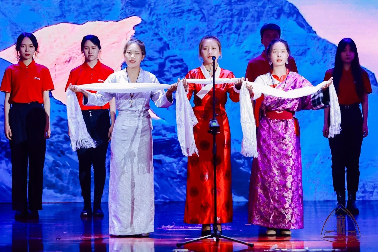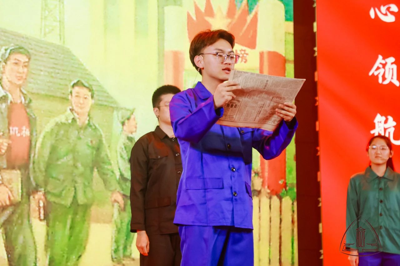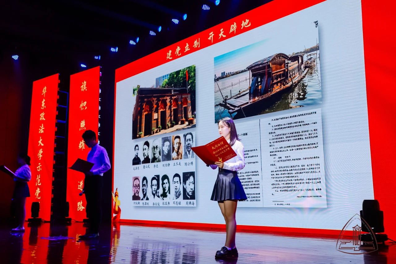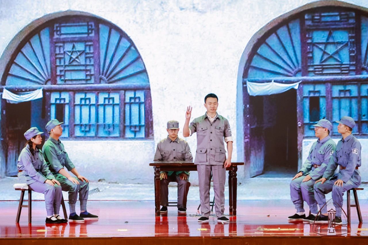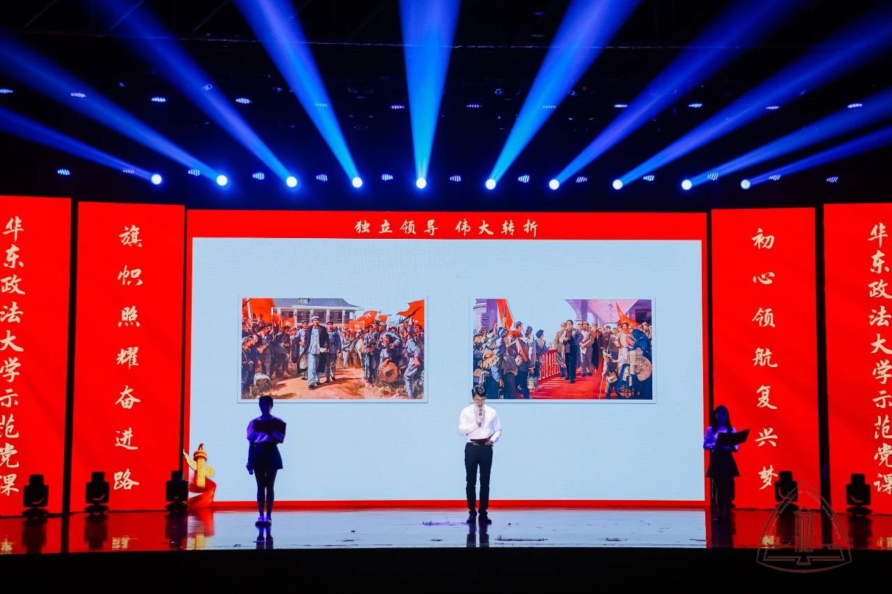 示范党课第一篇章在合唱声中拉开帷幕,领唱学生身着不同民族服装倾情演唱《唱支山歌给党听》,将大家的思绪带到了1921年7月23日那个夜晚,自从有了中国共产党,中国革命的面目焕然一新。历史的长河波涛汹涌,关键处往往只有几步,从中共一大到古田会议再到遵义会议,在学生党员的讲述中,大家又一次重温了我党从幼年走向成熟的过程。