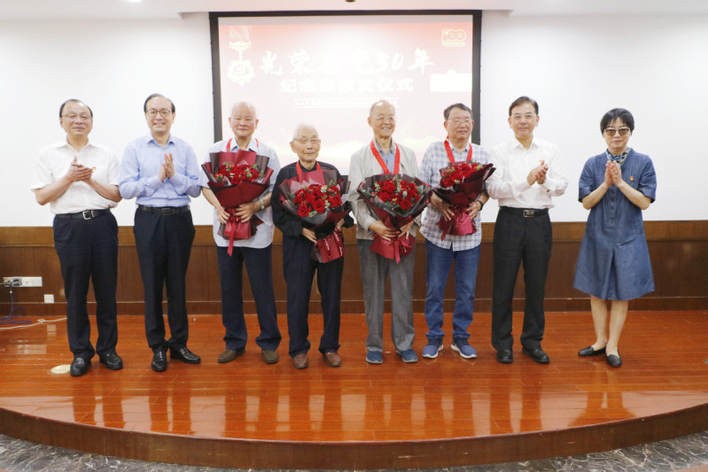 我校有87名党员荣获“光荣在党50年”纪念章,平均年龄84岁,其中党龄最长的达75年,年龄最大的党员96岁。郭为禄、叶青、应培礼、唐波为与会老党员颁发纪念章,并送上鲜花。为重温初心使命,学校还为老党员准备了一份特殊的礼物——初心印记,里面存有老党员当年撰写的入党志愿书复印件。