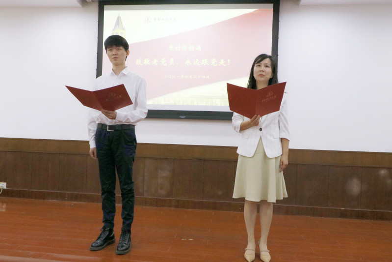 “我志愿加入中国共产党,拥护党的纲领,遵守党的章程,履行党员义务……随时准备为党和人民牺牲一切,永不叛党。”最后,在功勋教授徐建的带领下,与会党员面对鲜红的党旗重温入党誓词。