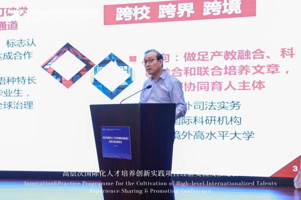 叶青在高校经验交流环节发表主题演讲,我校在获批教育部高层次国际化人才培养创新实践基地项目之后,积极探索和创新高层次涉外法治人才培养新模式。在纵向贯通学生成才成长通道方面,探索打破学段壁垒,创建“高-本-研”衔接的高层次涉外法治人才培养机制。延伸人才培养链,构建纵横交错的“跨校-跨界-跨境”式国际化人才培养新模式。在横向链好协同育人主体方面,做足“产教融合”“科教融合”和“联合培养”文章,协同涉外司法实务界、国际科研机构和境内外高水平大学,共同培养高端涉外法治人才。坚持知行合一,将提升国际实务能力作为高层次涉外法治人才培养的重中之重。进一步完善涉外法律实践实训教学体系,实施涵盖课程学习、实习实训和实习推送的全链条式全球胜任力培育项目。