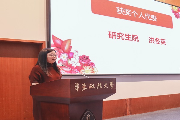 获奖个人代表、2019-2020年度上海市三八红旗手、研究生院院长洪冬英表示,作为一位有着近30年教龄的女法学教师,她有福气、有底气、有灵气;作为一名有着15年经历的女管理者,她不断探索管理思维、管理规律、管理成效;作为一名有着20年会龄的党外知识分子,她始终牢记党外干部也是党的干部,提高事业站位。