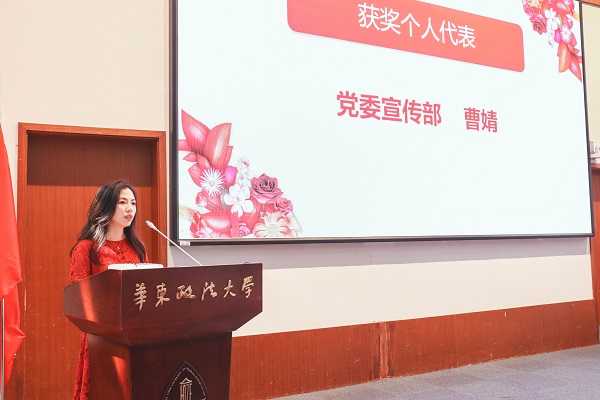 文骏管理创新奖教金获得者、党委宣传部曹婧老师讲述了校园文化建设之路,这是一条与国同梦,书写华政特色的奋斗之路;是一条砥砺奋进,探索文化高地的创造之路;也是一条以人为本,得民心、顺民意、惠民利的初心之路。