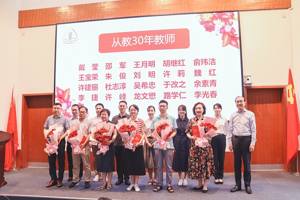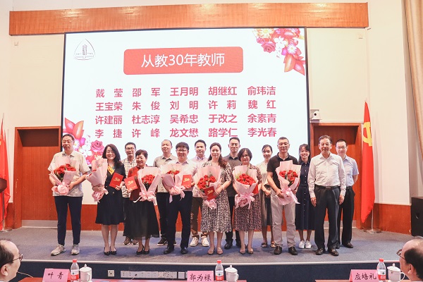 新进教师代表向从教30年教师敬献鲜花,校领导为从教30年教师和2020年度各级各类荣誉和奖项获得者颁发证书。