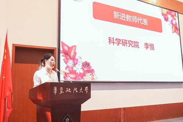 新进教师代表,科学研究院李恒老师代表全体新教师,对学校领导和前辈教师对新教师的信任和关怀表示衷心感谢。她表示作为“华政精神”的传承者,将全身心投入教育事业,以优异的教学和卓越的学术研究回馈学校和社会。