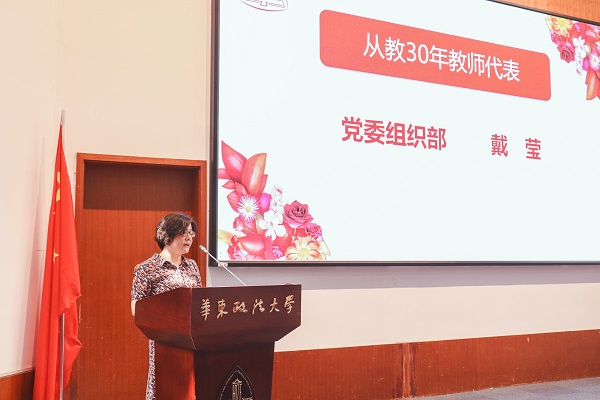党委常委、党委组织部部长戴莹代表从教30年教师发言。她深情感言,三十而立是理想、三十而已是人生、三十而励是情怀。她说,30年遇见华政是美好,做好自己是本份,而坚守初心则是责任。在人生最宝贵的30年里,在华政成长、成熟,收获了经历、经验,也更加坚定前行。以从教30年为题,是感恩,是回眸,更是展望。