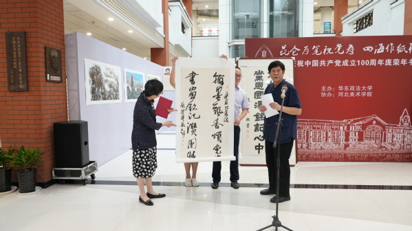 庞荣年在答谢辞中表示非常高兴来到华政,在美丽的华政校园以书画展形式呈现中国共产党奋斗历程,弘扬中华传统优秀文化。他还向学校赠送礼品《庞荣年画集》和书法作品“翰墨飘香颂党史,书画铭记赞国情”。唐波代表学校接受了赠礼。