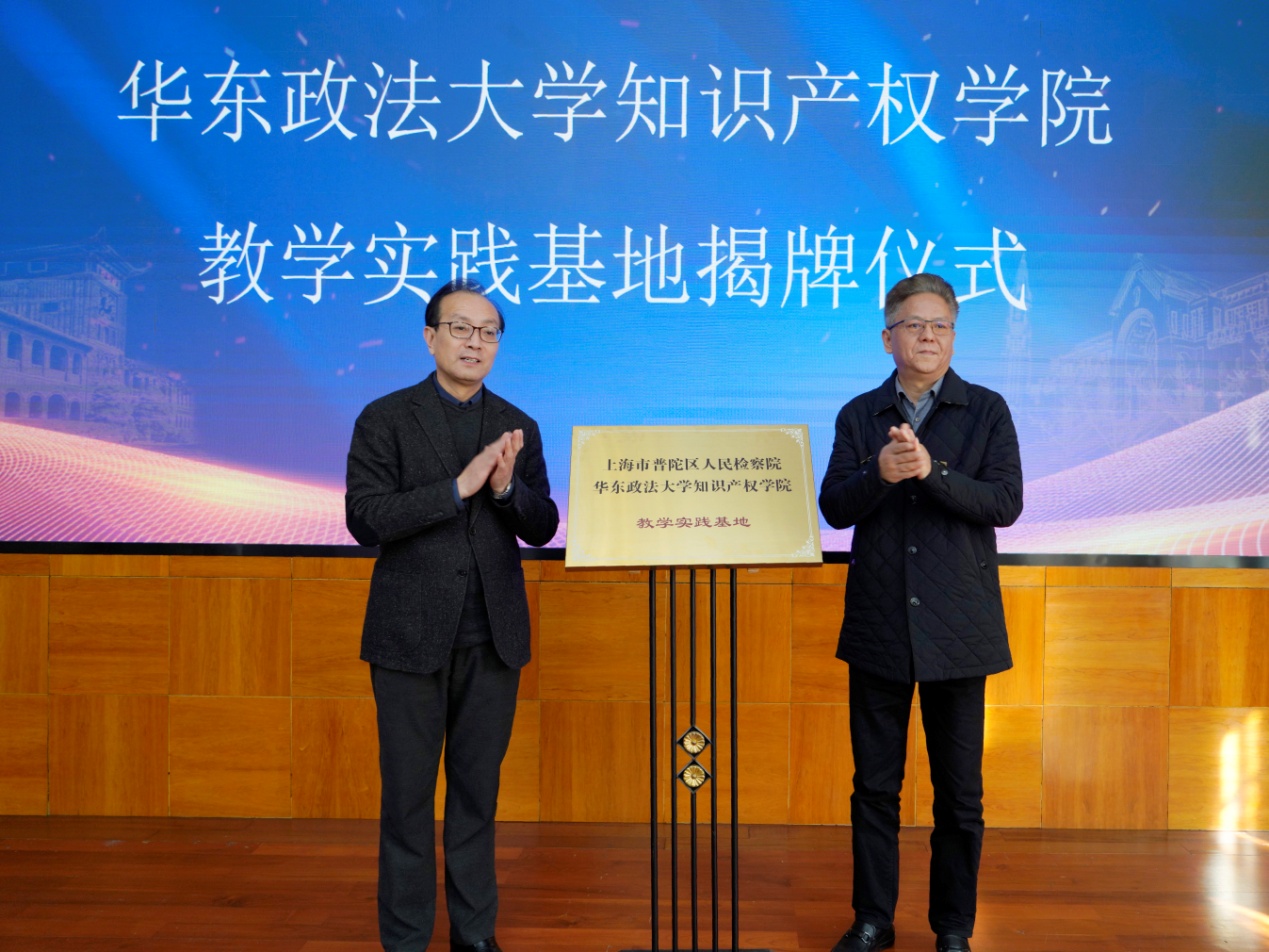 在论坛仪式环节,叶青、龚培华共同为“上海市普陀区人民检察院、华东政法大学知识产权学院教学实践基地揭牌仪式”揭牌。
