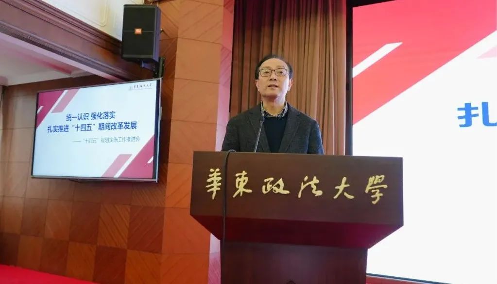 他强调,要以“追求卓越”的精神扎实推进“十四五”规划。一要全面贯彻高质量发展理念。能否实现高质量发展,是决定学校一流政法大学建设目标能否实现的关键。要以高质量发展指引人才培养工作,全面提高人才培养质量;以高质量发展指引科学研究,切实履行繁荣哲学社会科学、构建中国特色话语体系的光荣使命;以高质量发展指引社会服务,为全面依法治国和卓越全球城市建设贡献华政智慧;以高质量发展指引国际交流与合作,推进中国高等教育走向世界,建设教育强国;以高质量发展指引文化传承与创新,着力为人类文明发展、中国文化自信作出应有贡献。二要全面持续深化改革。改革是发展的前提,是事业发展的唯一出路。要对学校所处的环境、面临的压力保持清醒的认识,保持居安思危的意识和能力、追求卓越的习惯和热情、不懈奋斗的冲劲和动力。要找准影响学校发展的“难点”“痛点”和“堵点”问题,分析问题背后的深层次原因,以“长痛不如短痛”的勇气大刀阔斧深化改革,理顺体制机制,为一流政法大学建设扫清障碍、保驾护航。三要聚焦核心发展目标。“一流政法大学”和“法科一流、多科融合”是学校的核心竞争力。建设一流政法大学,首先要建设一流法学学科。要聚焦全面依法治国战略,聚焦国家和区域经济社会发展需求,聚焦重大和前沿问题,以“高峰”带动法学学科整体走向一流。其次,要切实把握学科建设规律,探索“法学+”“+法学”建设路径,在支撑法学学科形成特色、走向一流的同时,促进相关学科的高水平特色化发展。四要坚持重大任务牵引。一流政法大学建设是一项系统工程,为了实现目标,学校设计了“512计划”。“512”计划是学校“十四五”规划的“四梁八柱”,其成败关乎一流政法大学建设目标能否实现。各牵头协调部门要切实负起责来,尽快形成具体的行动方案,明确参与部门、学院的具体任务,明确阶段性目标和时间节点。