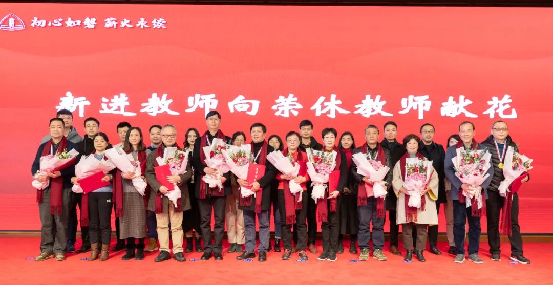 新进教师代表向荣休教师代表献花。