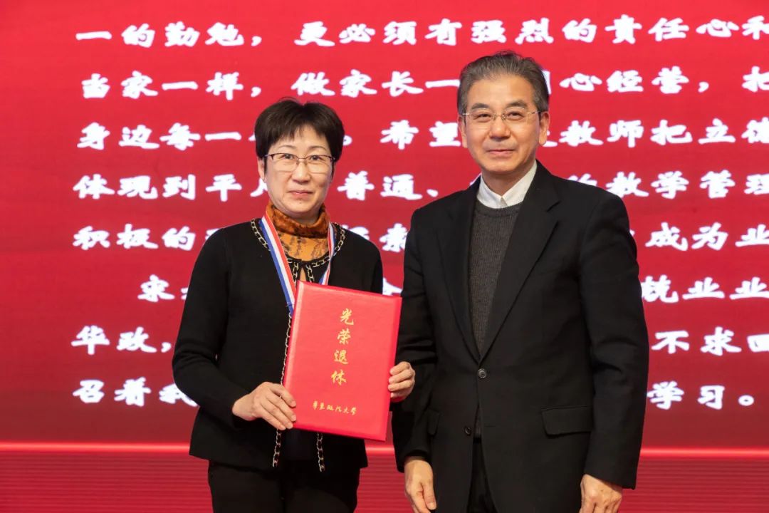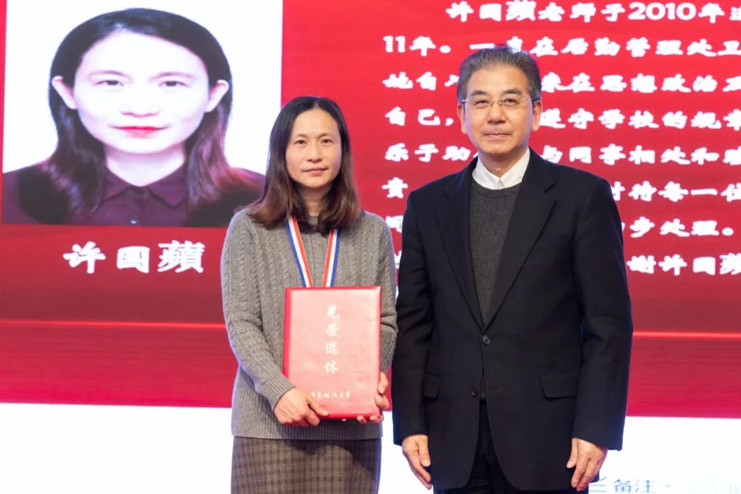 校党委副书记唐波、副校长韩强为荣休教师赠送纪念品。