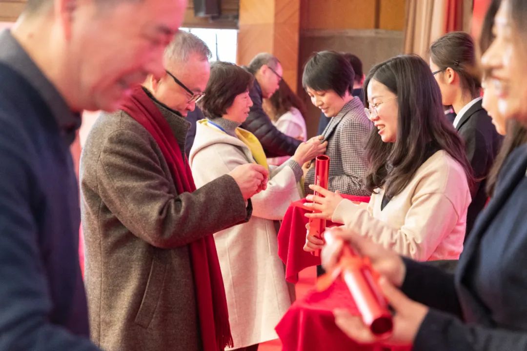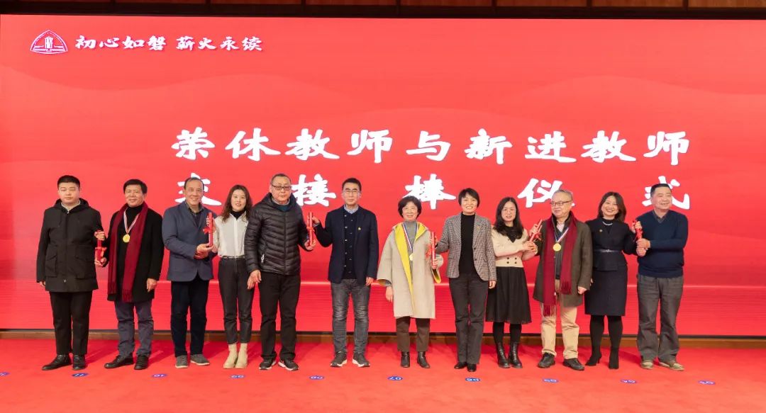 荣休教师代表童之伟、肖国兴、李成明、滕世华、陈庆权、周立表为李文莉、王明国、戴洁、李恒、胡婷、宋伟哲等新进教师代表佩戴校徽,交接师德传承接力棒。