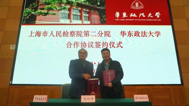 近日,我校与上海市人民检察院第二分院合作协议签约仪式在长宁校区交谊楼举行。上海市人民检察院第二分院党组书记、检察长陈思群,副检察长陈春兰,党组成员、副检察长顾晓敏,党组成员、政治部主任余杭明;校党委书记郭为禄,党委副书记、纪委书记应培礼与第二分院和学校相关部门及专家代表参会。签约仪式由副校长韩强主持。