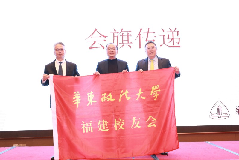 应培礼代表校友会宣布同意换届的批复,第三届理事会陈明添会长向第四届理事会当选会长许永东传递了福建校友会会旗,代表华政精神代代传承。