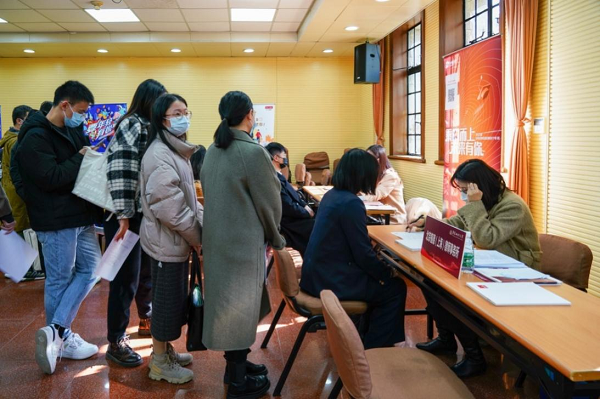 同时,我校2022届毕业生校园招聘会(第4场)在交谊楼一楼举行。上海市锦天城律师事务所、上海蔚来汽车用户服务有限公司、北京植德(上海)律师事务所、无印良品(上海)商业有限公司、上海银行股份有限公司、天风证券股份有限公司等10家单位参会。共计发布岗位数量1153个,应聘学生381人,用人单位收到简历355份。招录岗位性质贴近我校毕业生需求,反响较好。