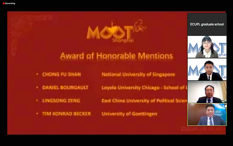 3月25日下午,本届Moot Shanghai决赛通过全网直播方式进行,经过近两个小时的精彩对决,美国芝加哥洛约拉大学一举夺魁,成为Moot Shanghai 2022总冠军,新加坡国立大学获得亚军;我校曾灵淞同学获得荣誉奖。