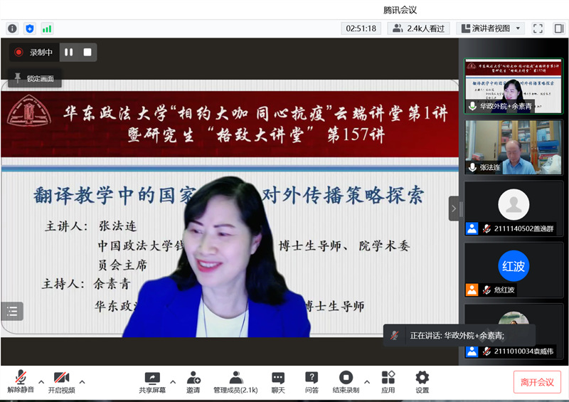 4月10日,由我校研究生院主办、各学院承办的“相约大咖 同心抗疫”云端讲堂系列讲座开讲。第一讲由中国政法大学钱端升讲座教授、博士生导师张法连主讲,主题为“翻译教学中的国家意识与对外传播策略探索”。此次讲座也是我校研究生格致大讲堂第157讲,由我校外语学院院长余素青教授主持。