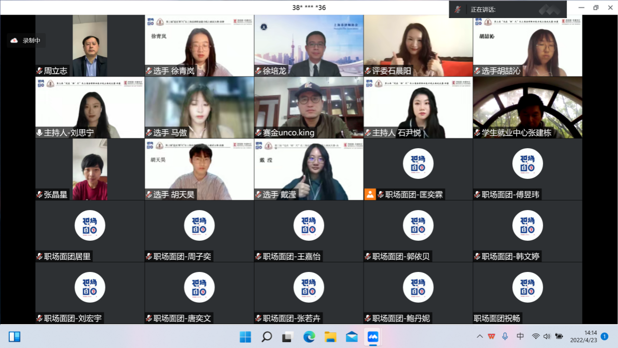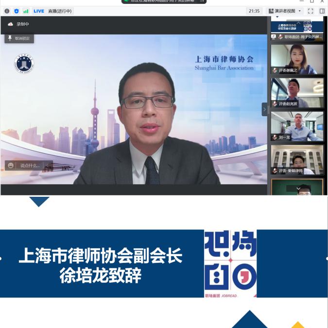 4月23日下午,第三届“近在‘职’尺”长三角法律职业能力线上面试大赛(简称“大赛”)总决赛在线上顺利举办。上海市律师协会副会长、上海市君悦律师事务所高级合伙人徐培龙,副校长周立志,党委学生工作部部长、学生处处处长陈赛金,党委学生工作部副部长、学生处副处长张建栋,校团委书记兼党委学生工作部副部长张晶星,以及来自8家律所的10位律师评委出席决赛。