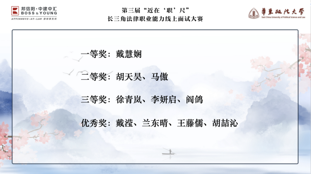 据悉,大赛历时一个月,获得了上海市律师协会、长三角地区21所高校、30余家律所、40余位合伙人律师的鼎力支持,同时吸引了各媒体机构特别关注。自3月25日开启选手报名通道以来,共收到近300份来自海内外选手的报名邮件。总决赛在“华政青年”视频号和B站直播间同步直播,历时近5个小时,视频号直播观看2622人次,获赞数5319;B站直播间人气峰值1763,稳居B站直播“高能榜”第8名。作为大赛主办方,学校一直以来力图给拟在法律行业求职的在校生提供机会,感受求职面试实况,提升求职技巧,锻炼在校生面试实战能力,帮助疫情中的应届毕业生尽早落实就业,举办三届以来,已帮助50名余法学生获得就业或实习机会。