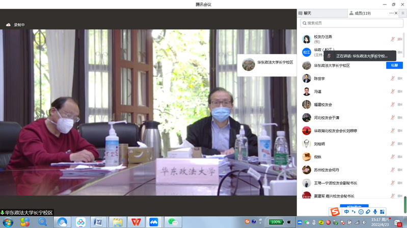 校友会理事朱树英介绍了其所在上海市建纬律师事务所吸纳华政毕业生就业情况,高度肯定我校毕业生的实践能力,并希望继续引进更多优秀学子,在严峻的形势下为母校多做贡献。