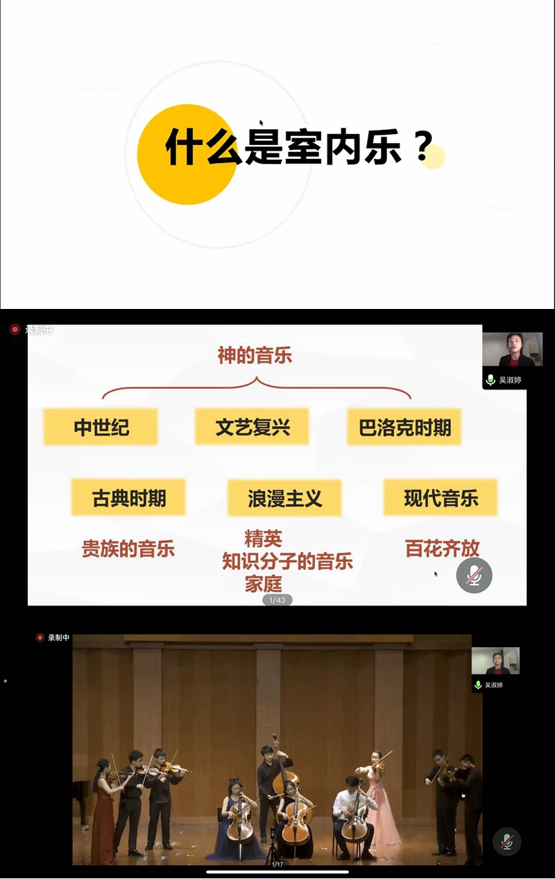 吴淑婷是室内乐演奏家、上海音乐学院国际室内乐中心副主任、上音附中室内乐学科副科长、“汉”四重奏成、ELA友人室内乐社团长。她围绕什么是室内乐,室内乐与教堂、歌剧院音乐的区别,了解室内乐的多种编制,欣赏经典的室内乐作品四个方面展开。将近2个小时的讲座,除让学生获得了室内乐的相关知识外,还让学生领略了巴赫、海顿、莫扎特、贝多芬、舒伯特、勃拉姆斯、舒曼、德沃夏克、李斯特等音乐大师的知名作品。