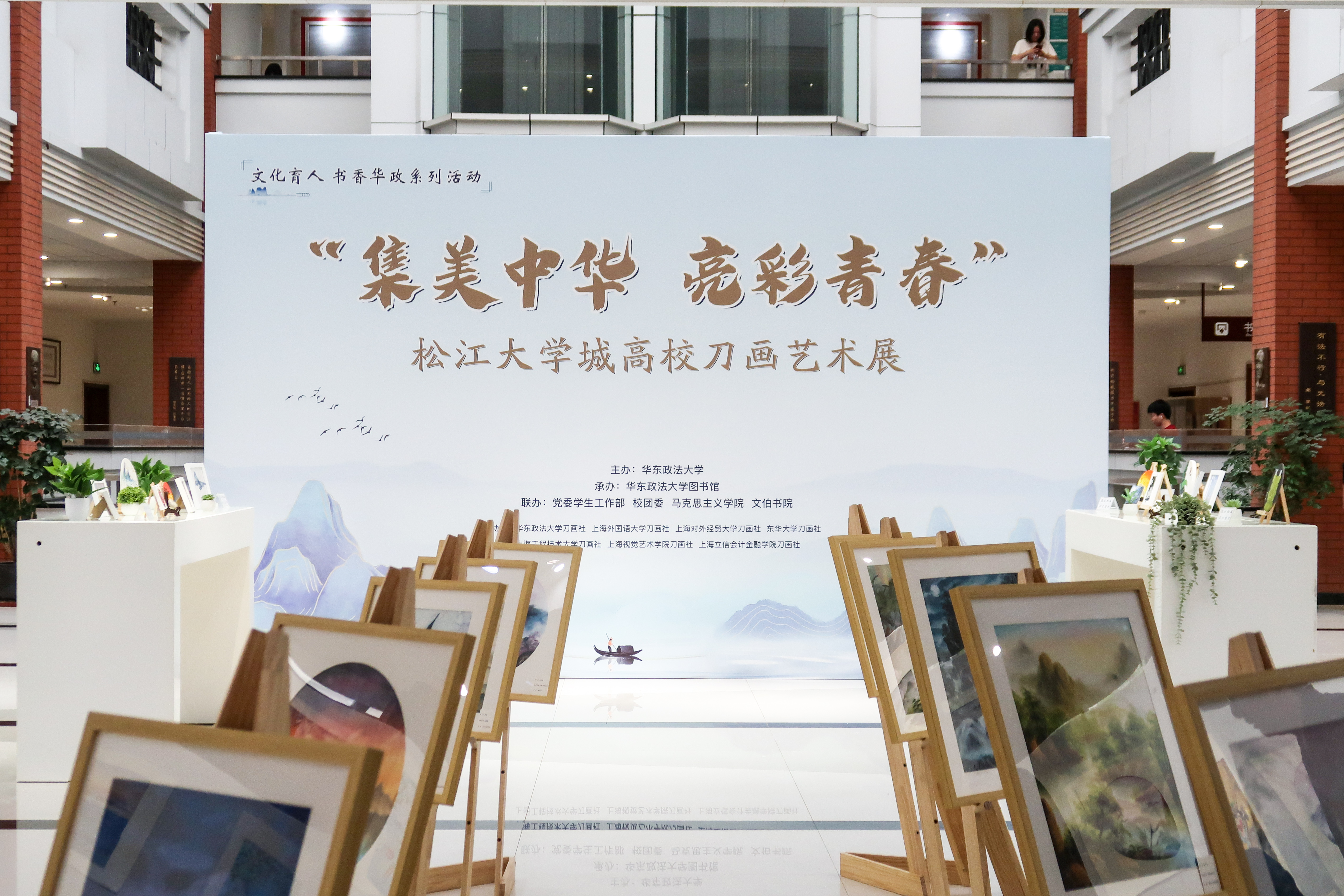 活动开幕式还集中展示了我校图书馆党建育人、文化育人、书香育人的两项特色探索成果。与会师生集体参观了“集美中华 亮彩青春”松江大学城高校刀画艺术展。本次刀画艺术展,以学生成果为展出主角,荟萃松江大学城八校刀画艺术社团的优秀作品和创意成果,我校刀画社社长谢仁敏同学向大家汇报了社团建设历程和优秀成果。会上,还发布了“谁是校园策展人”活动评选结果。学生策展人徐东启介绍了“墨云书展”的设计、举办情况及未来展望。