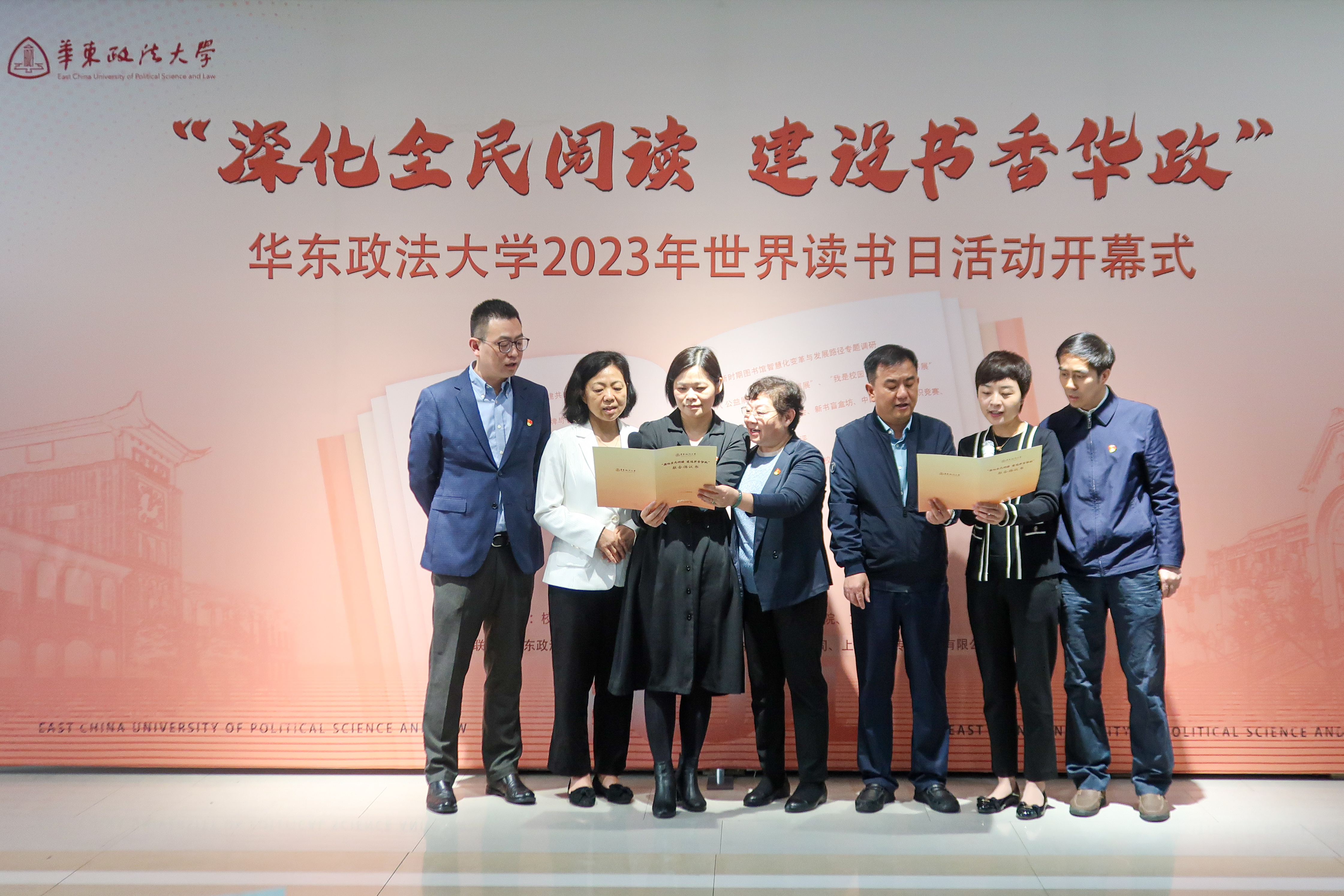 主题分享会环节,华政图书馆党总支会同华东政法大学附属松江高级中学,我校工会、党委教师工作部、党委学生工作部、校团委、马克思主义学院、文伯书院党总支发出深化全民阅读,共建书香华政的联合倡议。各联建单位纷纷表示将深化推进青少年读书行动和阅读育人,把深化全民阅读与立德树人根本任务相结合,把学习成果转化为群众办实事的服务能力。华东政法大学附属松江高级中学校长陈栋、副校长李捷表示,非常高兴参加我校世界读书日系列活动,作为联建单位将充分发挥党建联建合作优势,在青少年法治教育、大中小思政一体化、团学骨干培养、学生志愿服务等领域深入开展共建。