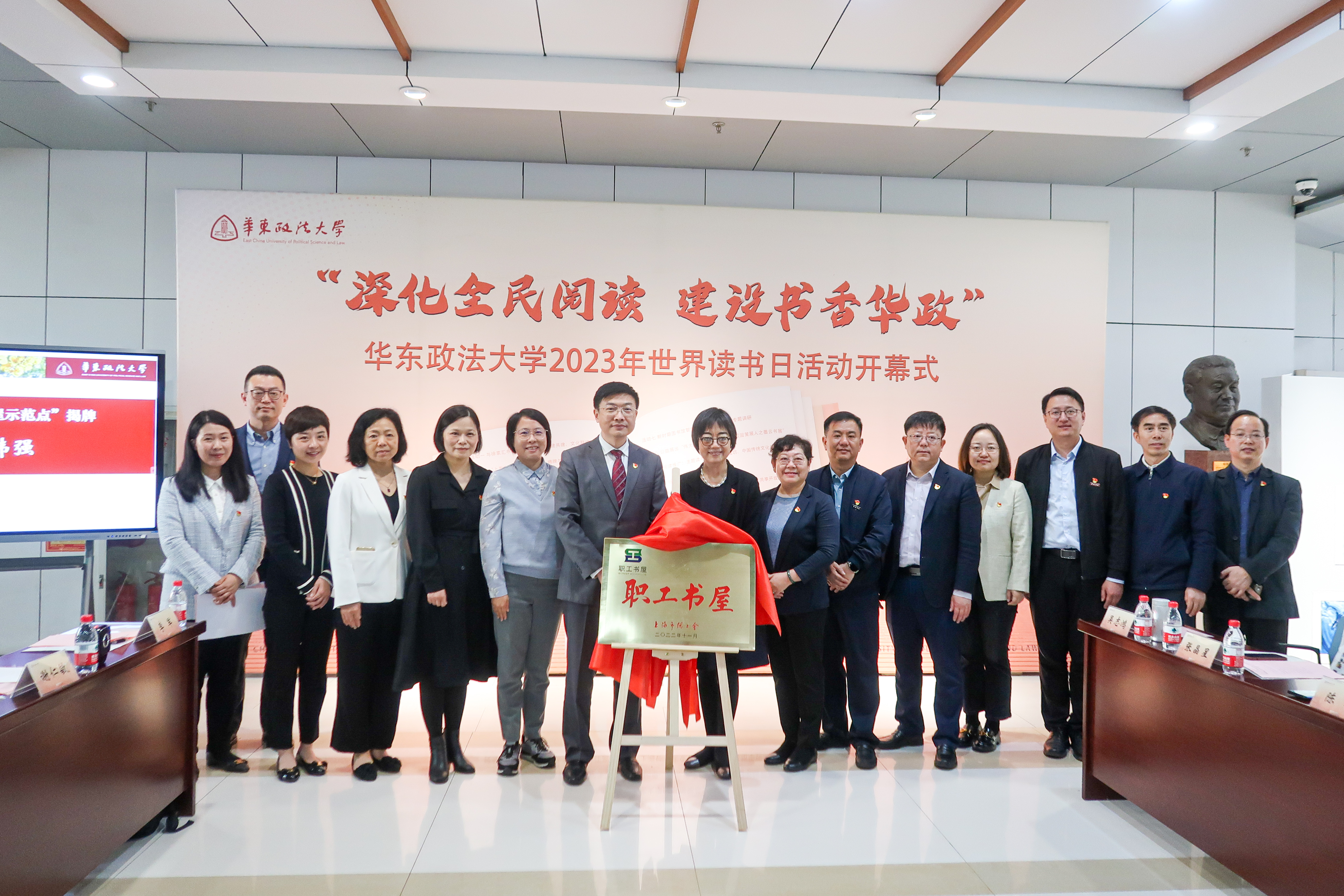 校党委副书记唐波和韩强为“上海市职工书屋示范点”华政教工书屋揭牌。校工会副主席邵军向与会师生介绍华政教工书屋成功申报“上海市职工书屋示范点”的过程。华政教工书屋由图书馆与校工会共同建设,作为教职工修养身心、自我提升的精神驿站,充分发挥阵地功能,打造文化交流品牌,努力做成高质量的教职工乐享空间。