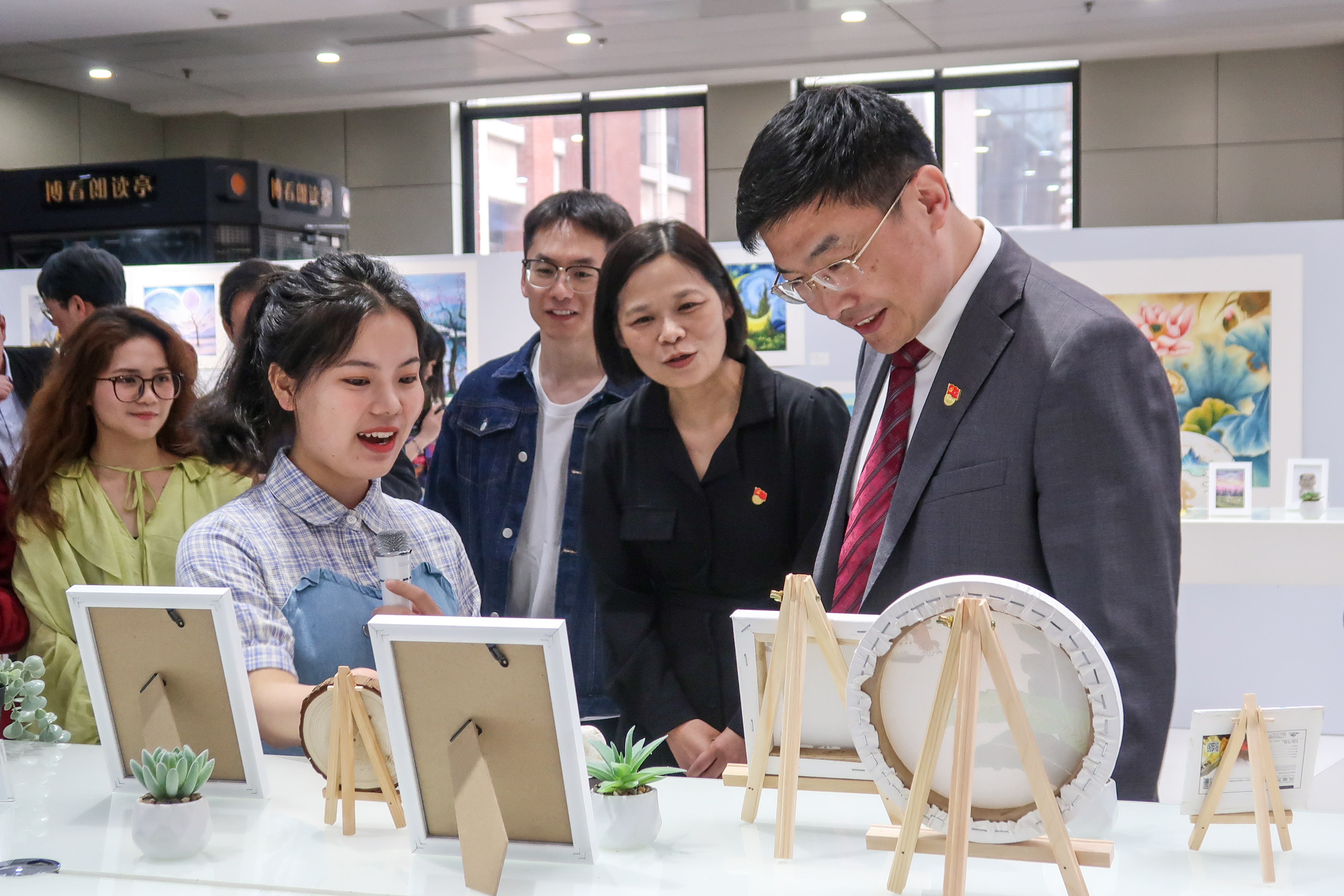 我校党委组织部副部长钱嘉熙、党委宣传部副部长李馥华、党委教师工作部副部长汤君、团委书记张晶星、文伯书院党总支书记寿新宝,马克思主义学院党委副书记黄巧荣,图书馆党总支书记黄紫红、副馆长吴高升出席活动。图书馆党总支委员、各支部书记、党员代表,松江大学城各高校刀画社师生代表参加活动。