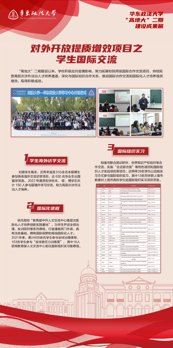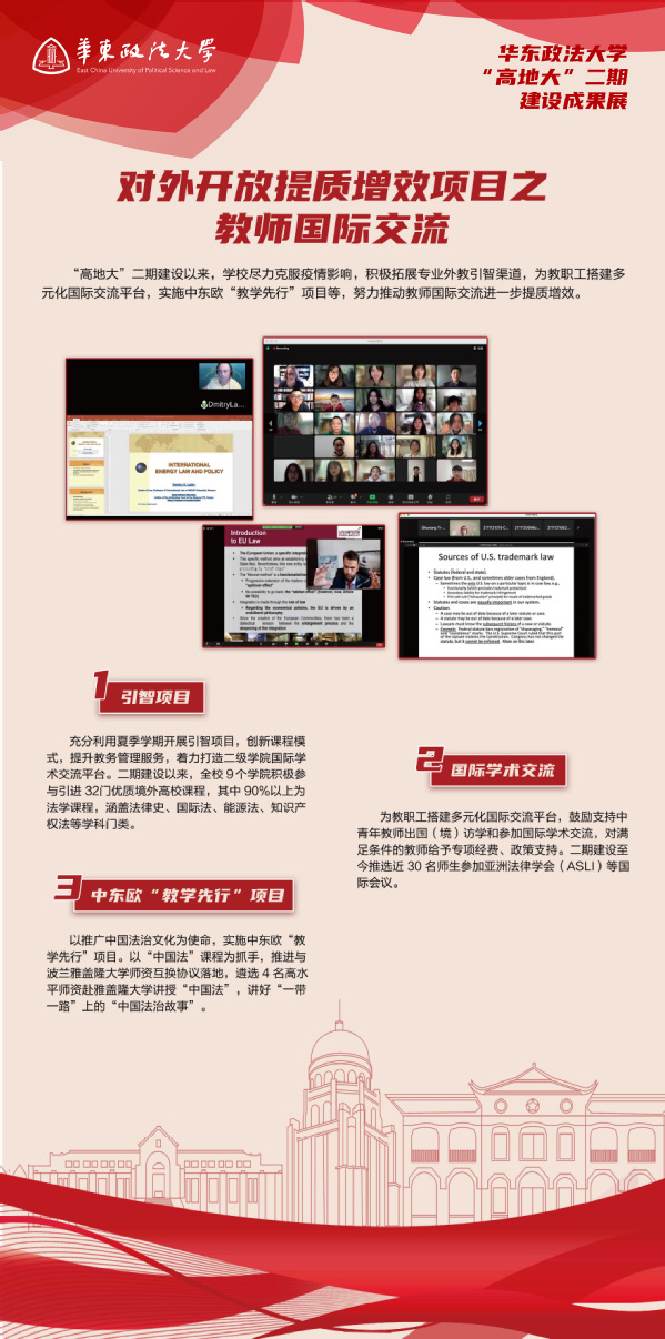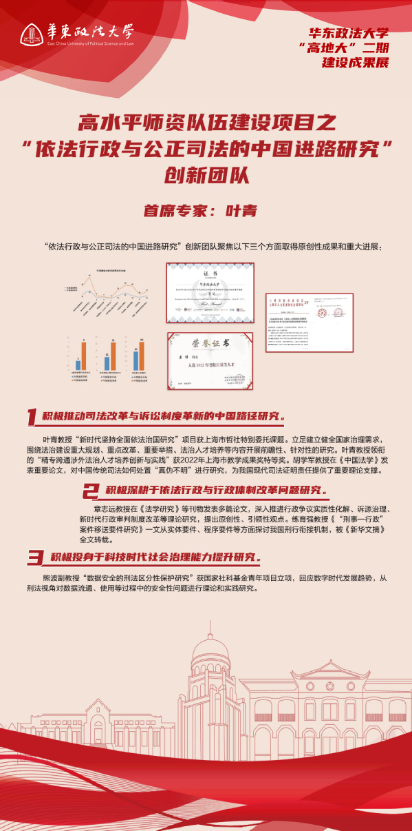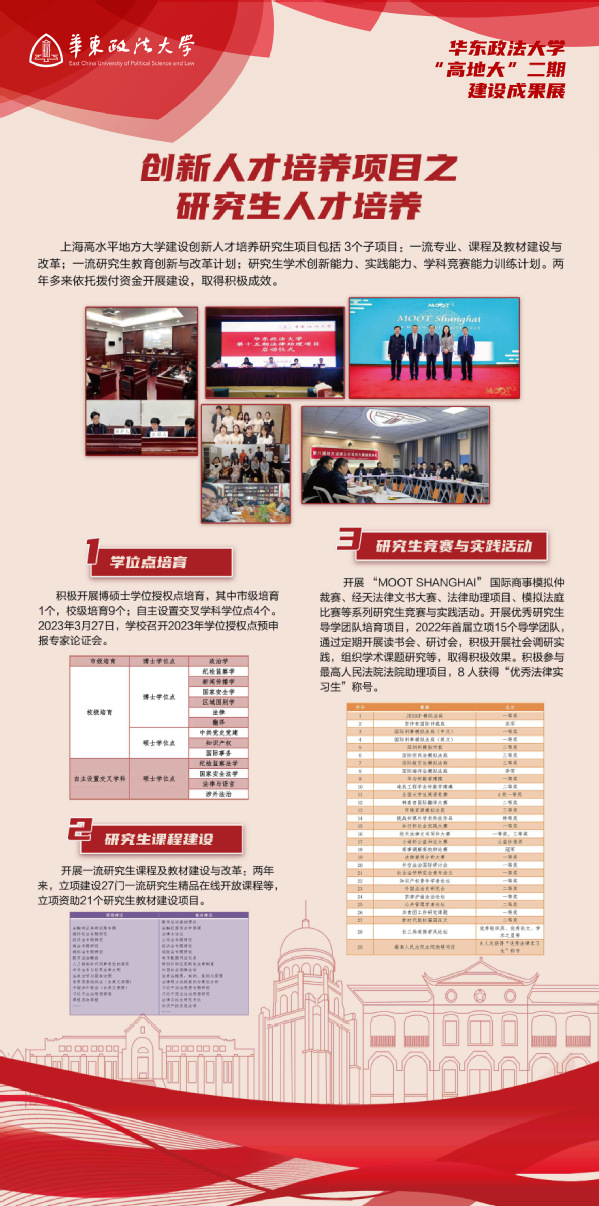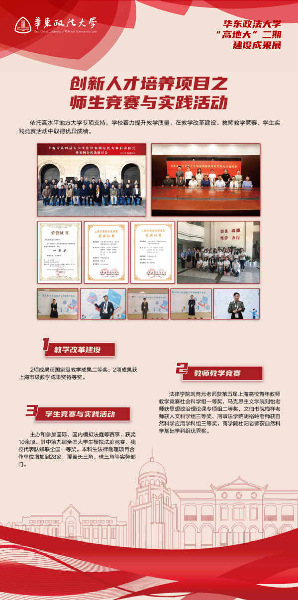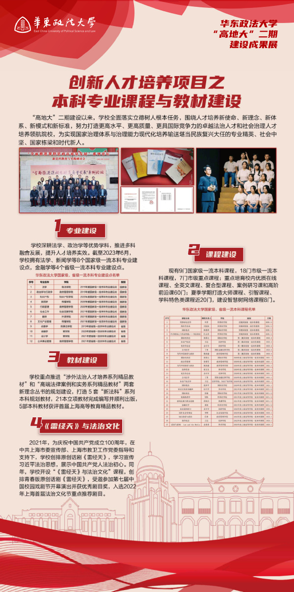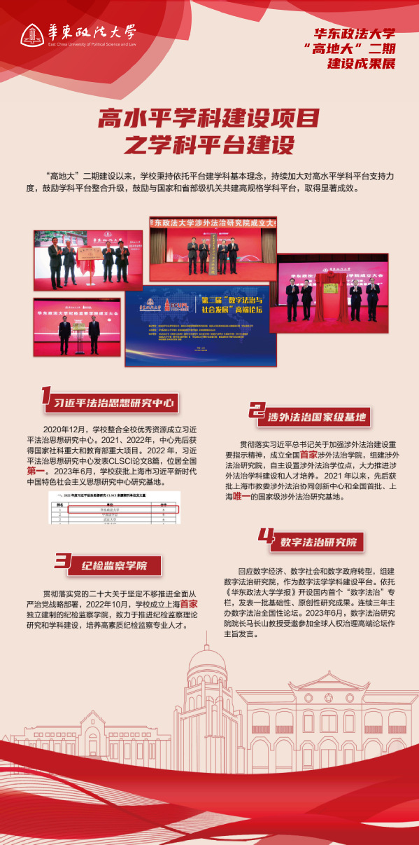 我校积极推进“高地大”二期建设五个子项目:高水平学科建设项目、高水平师资队伍建设项目、创新人才培养项目、对外开放提质增效项目、体制机制改革与条件保障项目等,坚持立德树人、德法兼修,服务国家战略,全力建设法治与社会治理人才培养领航院校。