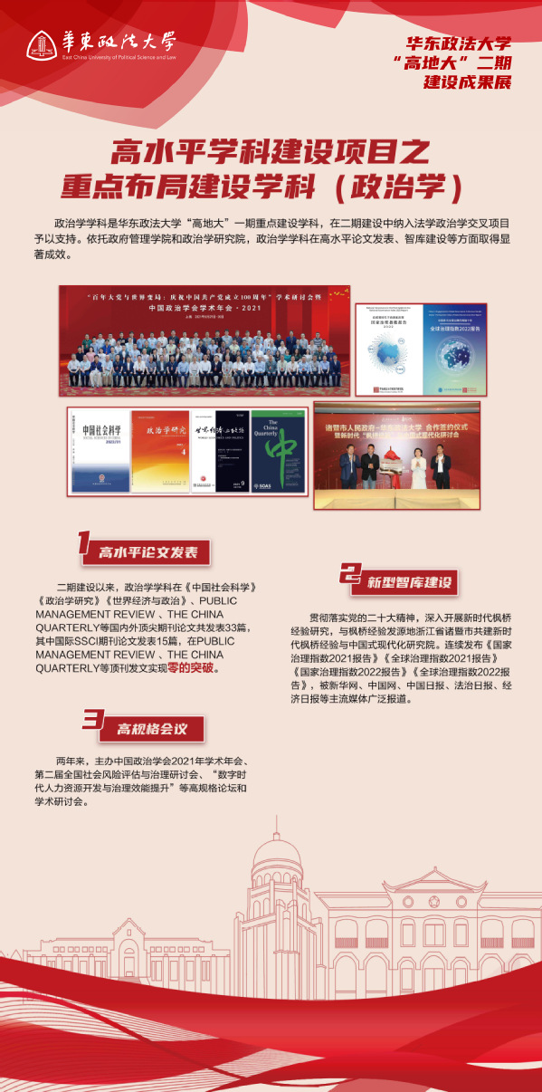 法学学科为高水平优势学科,先后入选上海市一流学科、上海市高峰学科,高水平一期、二期重点建设学科。法学所属法律史二级学科为上海市唯一的法学国家级重点学科。国际法、经济法、刑法等为司法部、上海市重点学科。政治学为“高地大”一期重点建设学科,公共管理为上海市一流学科、高原学科。马克思主义理论学科在国内具有一定影响。新闻传播学、应用经济学等具有特色和优势。在法学学科带动下,学校法、管、经、文等学科门类稳步前行。