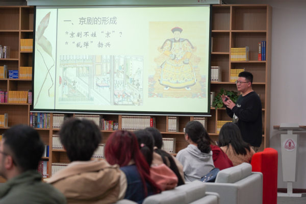 松江区民俗达人在现场推出了别出心裁的剪纸体验。戏曲社指导老师邱唐,为大家作京剧艺术导赏。