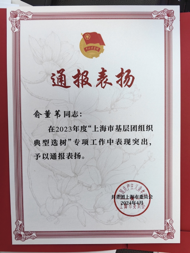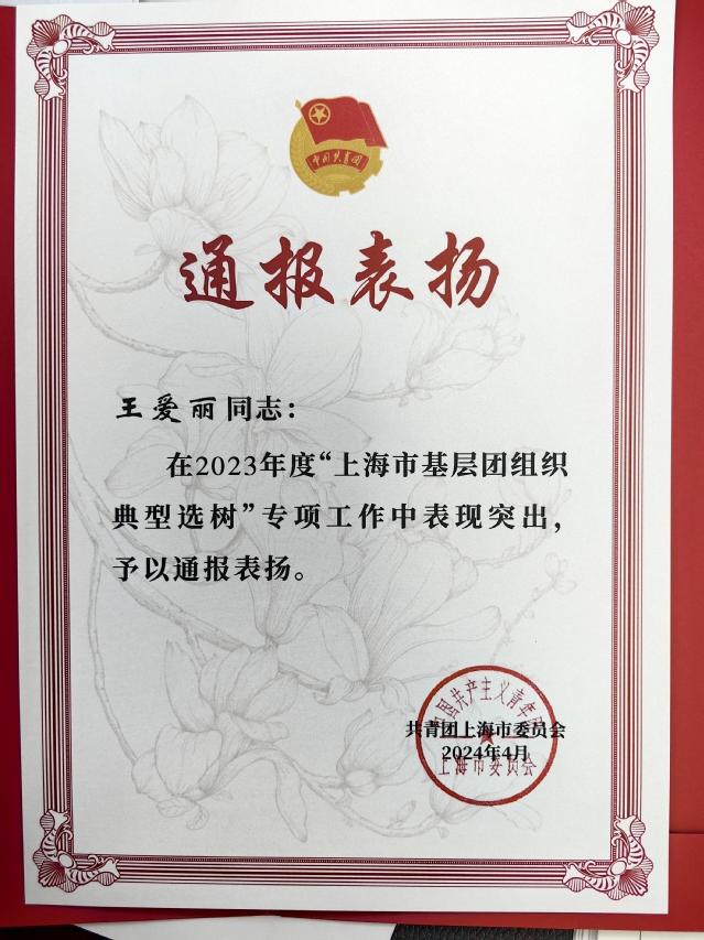 近日,2023年度上海市基层团组织典型选树结果公布。自2023年度上海市基层团组织典型选树工作启动以来,我校各基层团组织和团员青年以习近平新时代中国特色社会主义思想为指导,深入贯彻落实习近平总书记关于青年工作的重要思想和考察上海重要讲话精神,充分对标“政治建设好、组织基础好、联系服务好、作用发挥好”的选树标准,在争先创优过程中形成了比学赶超的生动局面,涌现出一批批典型集体。我校1个团组织、1个团支部和2名团干部获上海市基层团组织典型选树通报表扬。