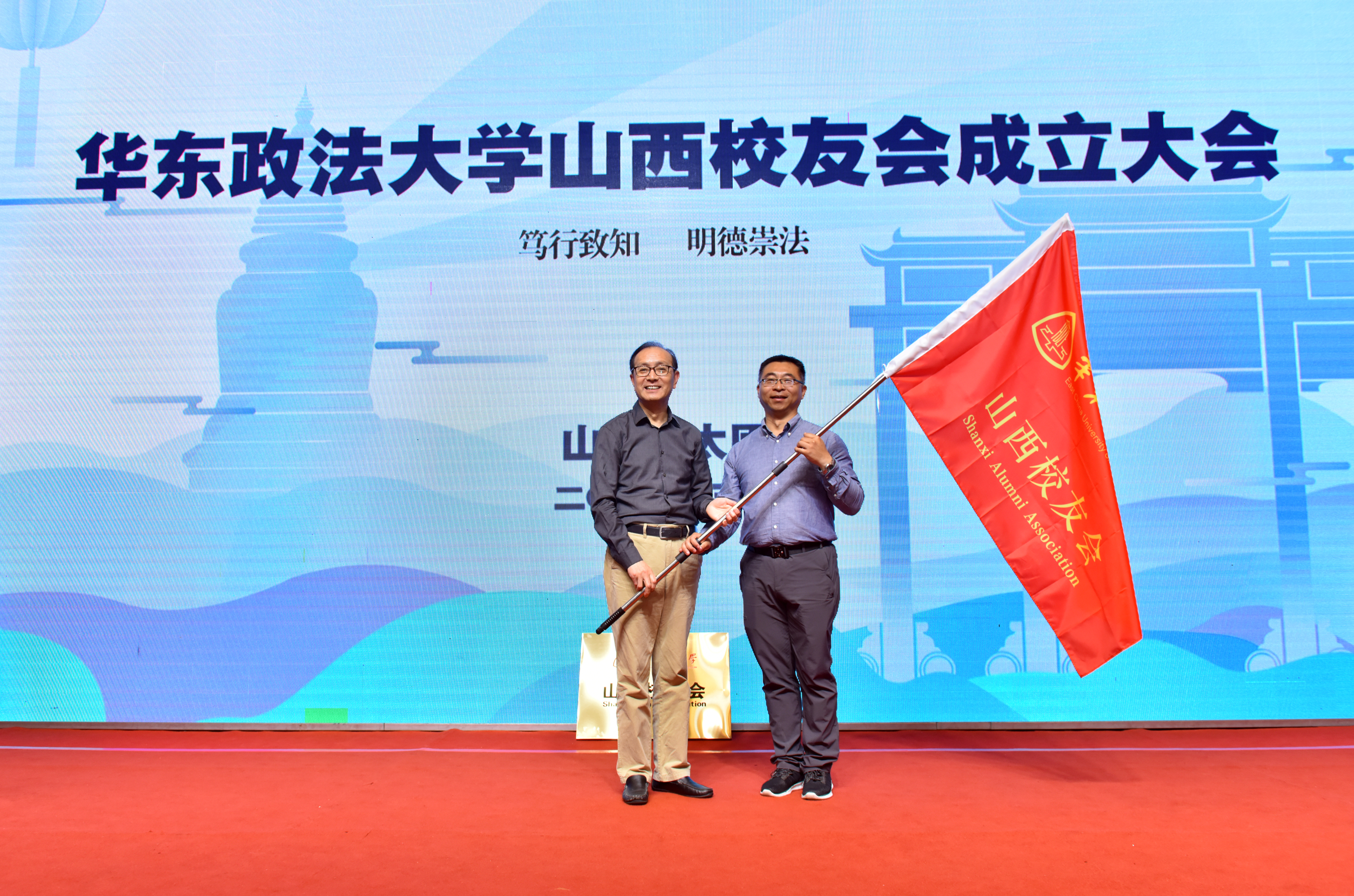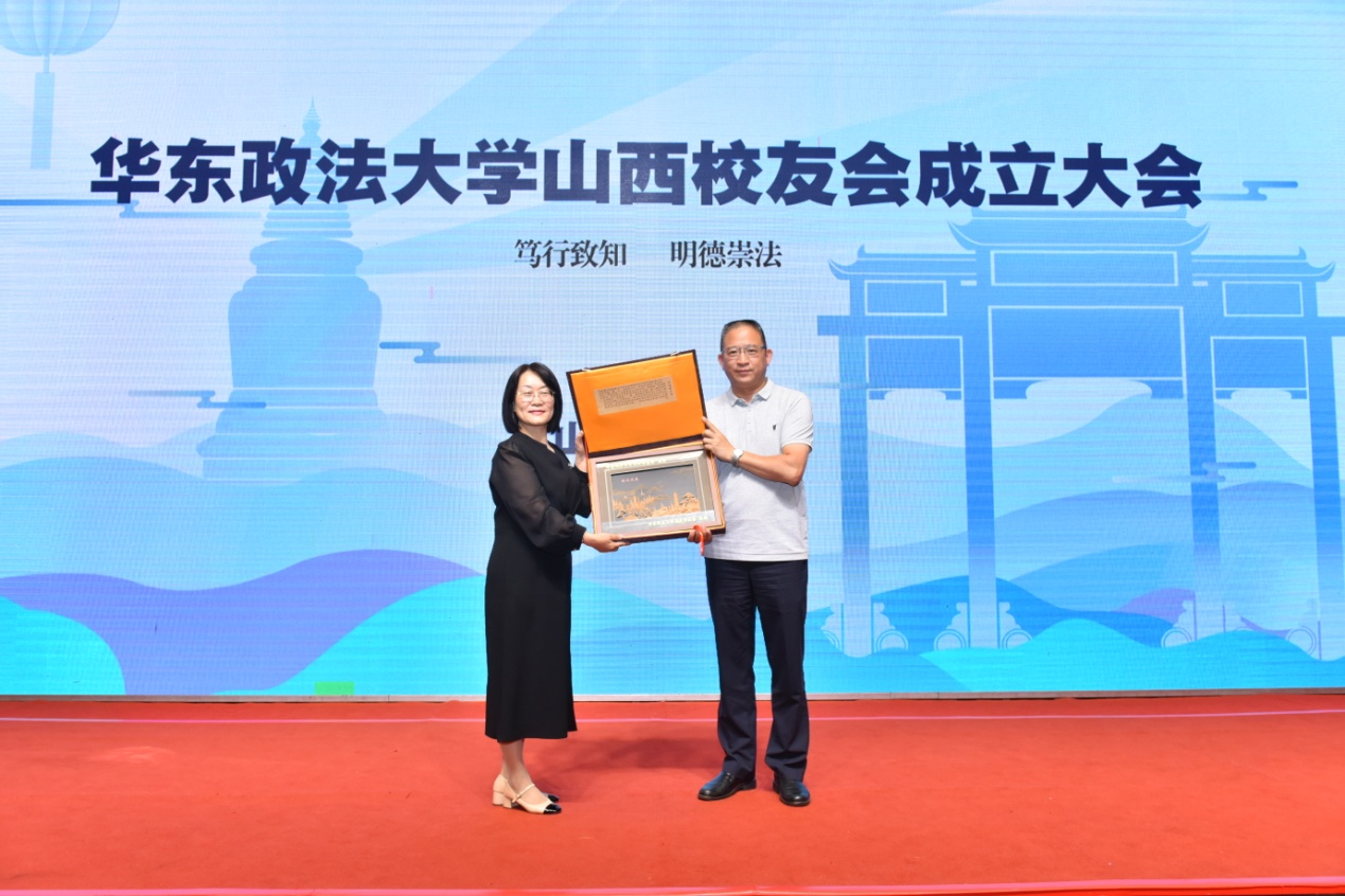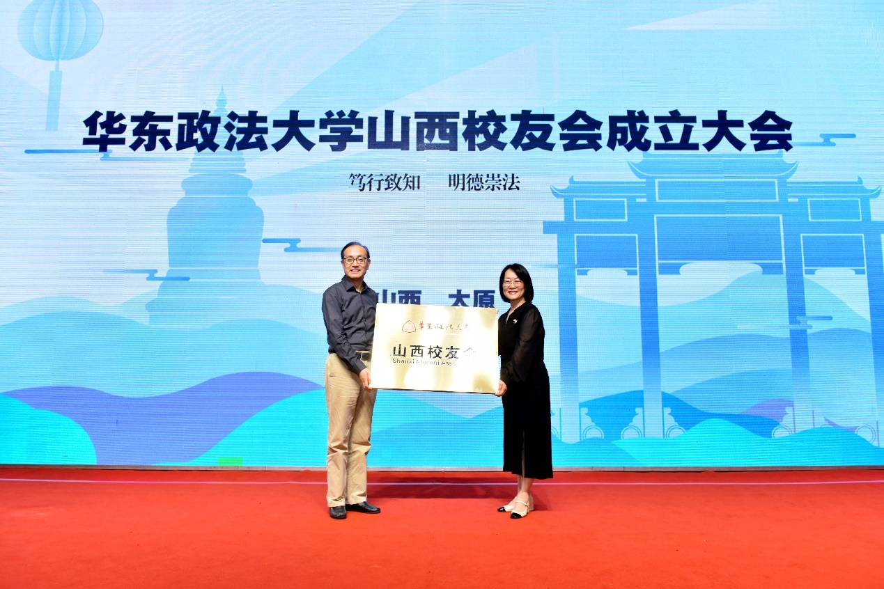唐波向大会宣读了《关于同意成立华东政法大学山西校友会的批复》,并与叶青一同为山西校友会第一届理事会负责人颁发聘书。叶青为山西校友会揭牌并授旗。伴随着热烈的掌声,会旗在主席台上飘扬,象征着山西校友会的正式启航。