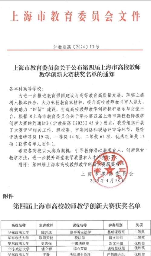 日前,上海市教育委员会发布《关于公布第四届上海市高校教师教学创新大赛获奖名单的通知》,我校五门参赛课程均获奖。其中,刑事法学院陈邦达老师作为《刑事诉讼法学》课程主讲教师,带领团队荣获基础课程组二等奖;经济法学院欧阳天健老师作为《税法学》课程主讲教师,带领团队荣获新文科组二等奖;法律学院史志强老师作为《中国法律史》课程主讲教师,带领团队荣获新文科组优胜奖;外语学院潘立春老师作为《综合英语》课程主讲教师,带领团队荣获课程思政组优胜奖;法律学院王静老师作为《法律职业伦理》课程主讲教师,带领团队荣获产教融合组优胜奖。