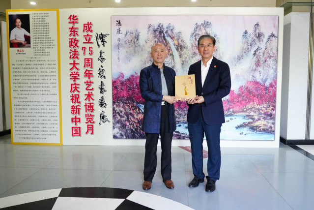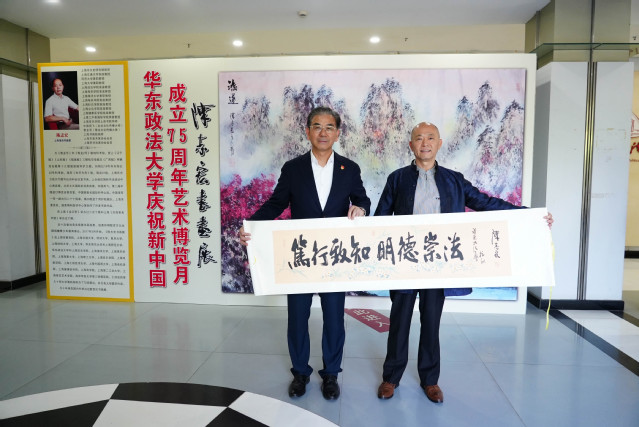 5月22日下午,我校庆祝新中国成立75周年艺术博览月开幕式暨陈志宏书画展在校史馆序厅举办。校党委书记郭为禄,著名上海海派书画家、上海市文史研究馆馆员陈志宏,文伯书院党政班子、师生代表,《丹青与书写》课程学生代表,“百外书社”学生代表参加开幕式。开幕仪式由文伯书院党总支书记寿新宝主持。