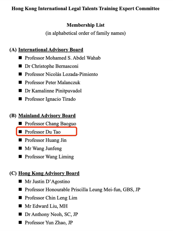 10月8日,香港特区政府律政司宣布成立香港国际法律人才培训专家委员会,以推动成立香港国际法律人才培训学院。香港国际法律人才培训专家委员会由三个咨询委员会组成,成员来自国际、内地和本地著名法律组织与大学的杰出法律专家和学者。其中内地咨询委员会委员共五人。我校国际法学院院长、涉外法治研究院执行院长兼首席专家杜涛教授受聘香港国际法律人才培训专家委员会委员。其他获聘委员分别是中国政法大学常保国教授、武汉大学黄进教授、金杜律师事务所王俊峰律师、中国人民大学王利明教授。