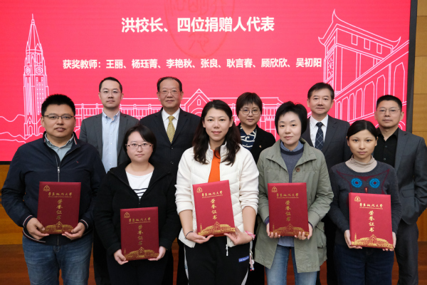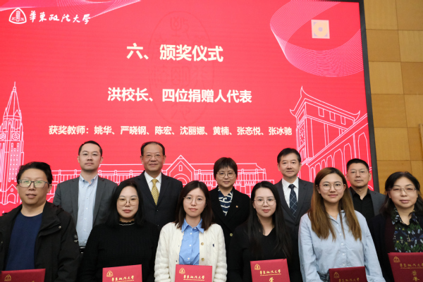 洪冬英,唐勇,王跃龙,金石律所副主任于元良、高级合伙人凌代坤共同为获奖教师颁发金石奖教金荣誉证书并合影留念。
