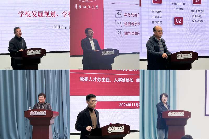 党委组织部、党委宣传部、党委统战部、党委人才工作办公室、人事处、发展规划处、学科建设办公室、教务处、科研处、国际交流处、资产管理处、工会、信息化办公室、图书馆、中外法律文献中心等职能部门负责同志先后介绍了学校发展规划、相关规章制度、管理服务机制和工作流程等,帮助新进教职工全方位、深层次了解学校,尽快转换角色、适应环境、胜任工作。