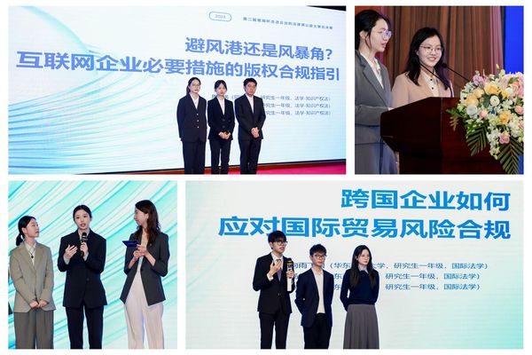 本届大赛吸引了来自全国各大高校的119组团队243位大学生参加,其中53组团队116名大学生入选复赛,8组团队21位选手闯入总决赛,奉献了一场场专业、凝练、精彩的法律公开课,并接受现场提问。最终,汪云昕、吴诗雨同学分享的《企业互联网推广中的风险识别与合规指引》、薛仪菲同学带来的《应对新规挑战,塑造企业未来――ESG合规治理新纪元下企业的实战策略》和李扬、张文宇、罗馨雨同学讲授的《企业数据跨境传输的合规路径》分获冠、亚、季军。