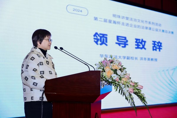 我校副校长洪冬英致辞表示,法学教育和法治人才培养在推进全面依法治国中占据重要地位,我校始终将培养“德才兼备的高素质法治人才”作为自身的使命与担当。“本届公益大赛创新法学教育形式,打破以行业前辈传授青年学子的传统法学教育形式,以青年学子面向企业代表、律师和教师进行分享,将学校、学生、企业、律所、司法局等多主体汇聚一堂,是探索人才培养的新模式、新方法的生动实践。”