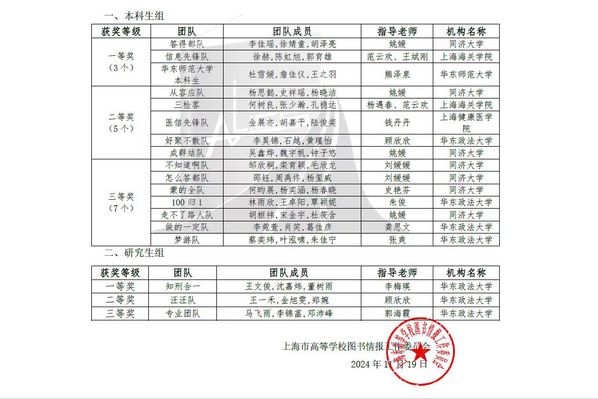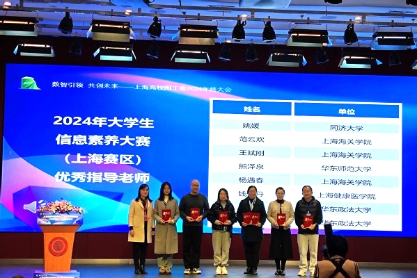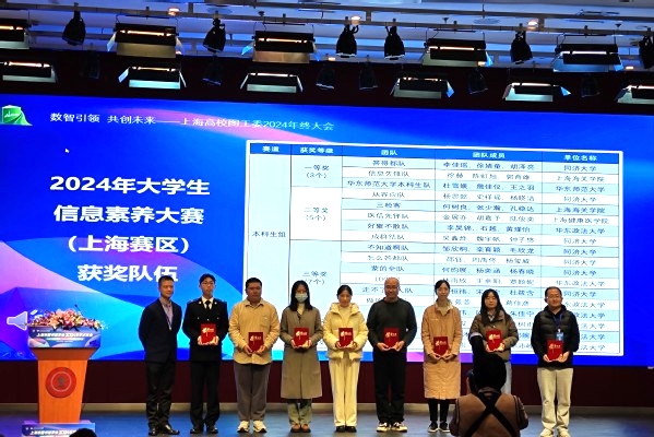 12月5日,上海市图书馆学会2024年学术年会在上海交通大学闵行校区召开,并举行2024年大学生信息素养大赛(上海赛区)颁奖典礼。本次大赛由大学生信息素养大赛组织委员会主办,上海市高等学校图书情报工作委员会协办。我校参赛队伍在激烈竞争中脱颖而出,参赛选手展现了超凡的信息处理能力、批判性思维和团队协作精神,最终研究生团队包揽大赛一、二、三等奖,本科生共有四支队伍分别获二、三等奖,图书馆参考咨询部李梅瑛、顾欣欣老师荣获优秀指导老师。研究生组一等奖获奖队伍“知刑合一队”代表上海赛区赴重庆参加大赛联赛。