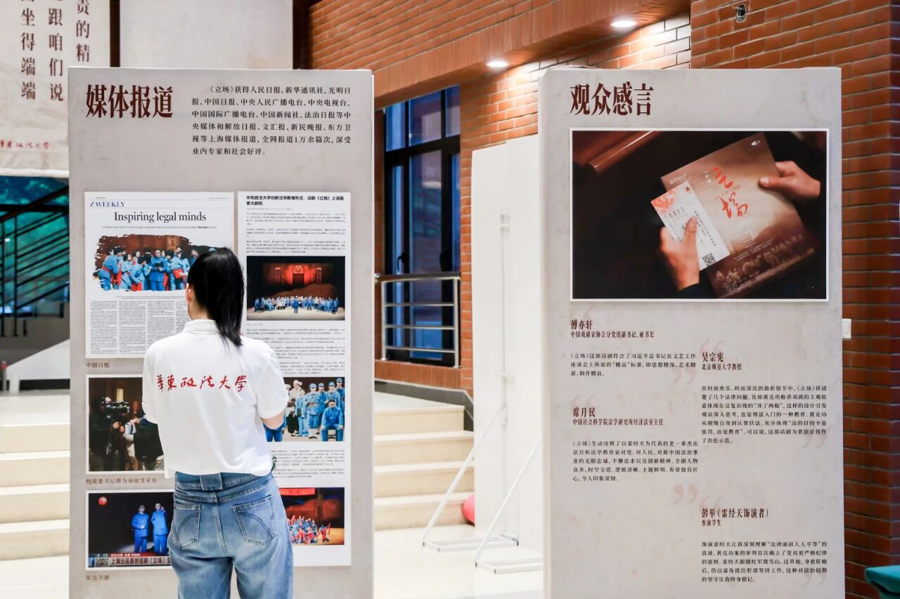 演出同步通过学校官方视频号进行直播,累计6千人次观看。同时,《岁月不居 立场不变——华东政法大学原创话剧<立场>图片展》在缘法厅大厅进行首展,回望法治人才培育初心。