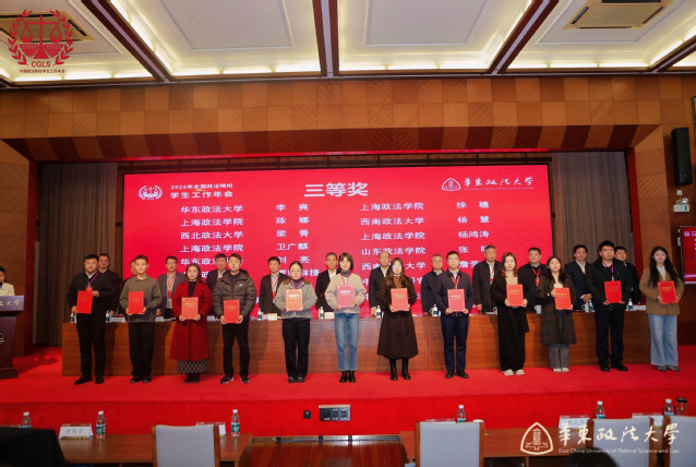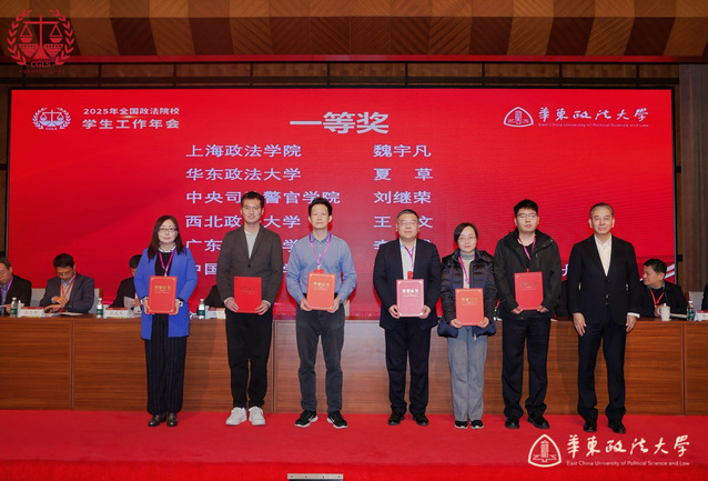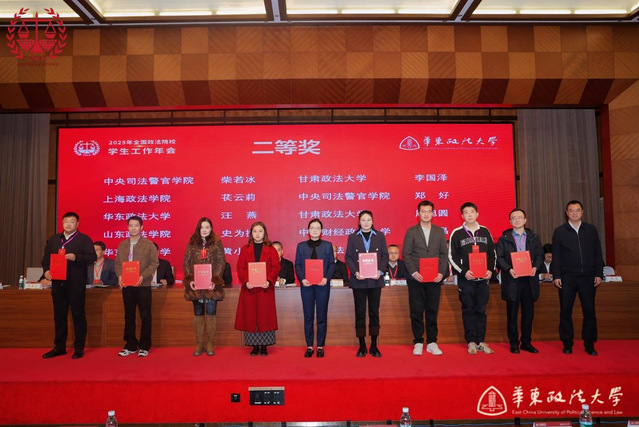 开幕式上,参会领导向全国政法院校学生工作年会优秀论文获奖代表颁发荣誉证书。其中,我校国际法学院辅导员夏草荣获一等奖,学工部汪燕、黄小园荣获二等奖,刑事法学院辅导员杨子豪、政府管理学院辅导员李爽、校团委刘亮荣获三等奖。