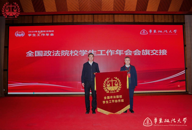 我校向下一届全国政法院校学生工作年会承办单位中南财经政法大学交接全国政法院校学生工作协作组会旗。陈狮向各兄弟院校发出2026年年会邀请。