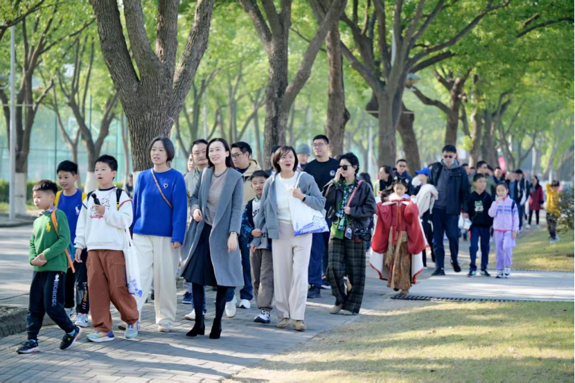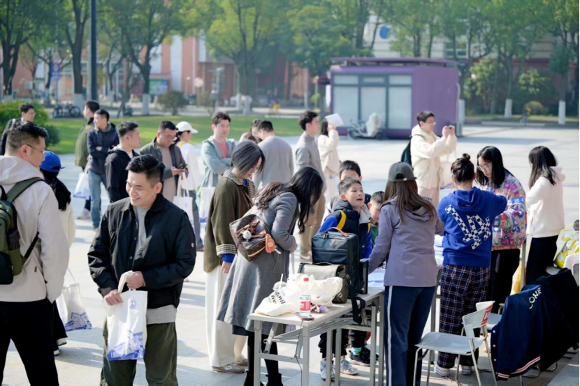 早晨9点,富田体育馆前已是人潮涌动。签到台前,校友们手持印有校徽的定制帆布袋与纪念T恤,笑容满面地与工作人员寒暄。展板区师生合影络绎不绝,定格的画面中既有阔别多年的同窗执手相视而笑,也有老师被众弟子簇拥合影的动人场景。校友们沿林荫道漫步,驻足于集英楼前追忆课堂时光,走进焕然一新的学院办公楼感受发展脉搏。特别设置的亲子互动区里,三代华政人共同打卡留念,为肃穆的教学楼增添温暖烟火气。校友们沿着精心规划的路线,漫步于曾经奔跑过的林荫道,驻足于挥洒过汗水的宿舍楼,也参观了熟悉的集英楼和明理楼崭新的学院办公室,最后在明珠楼台阶合影。每一处打卡点都像一把钥匙,打开了记忆的闸门。许多校友更是携家带口,在曾经熟悉的一草一木间,与亲人分享自己的青春岁月,欢声笑语中满载着对母校的深情。