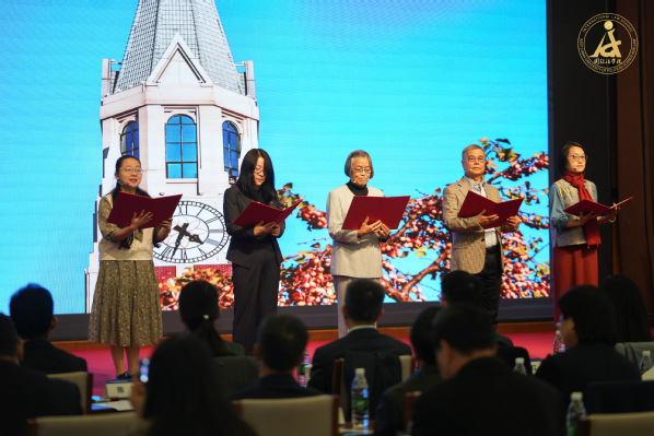 在大会致敬环节,我校功勋教授朱榄叶联袂李泳、魏红、于南、戴诗瑄、詹锦鸿六代国际法师生为纪念大会献上《献给华政国际法建系四十周年》的诗朗诵。青年教师和学生代表向与会的国际法学院前辈老师献花。